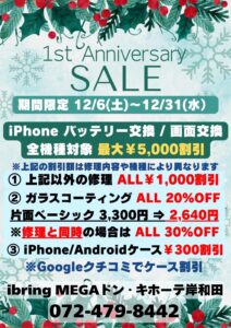 【岸和田】iPhone修理&アクセサリーが最大5,000円割引!冬の特別セール&1周年記念イベント【12/6(土)〜12/31(水)】新着!!